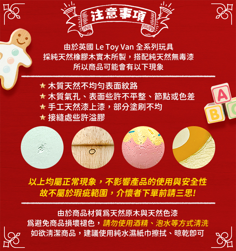 .由於英國 Le Toy Van 全系列玩具採純天然橡膠木實木所製,搭配純天然無毒漆,所以在商品上會有木質天然不均勻紋路,以及天然漆上漆不均勻的現象,都屬於正常的現象。