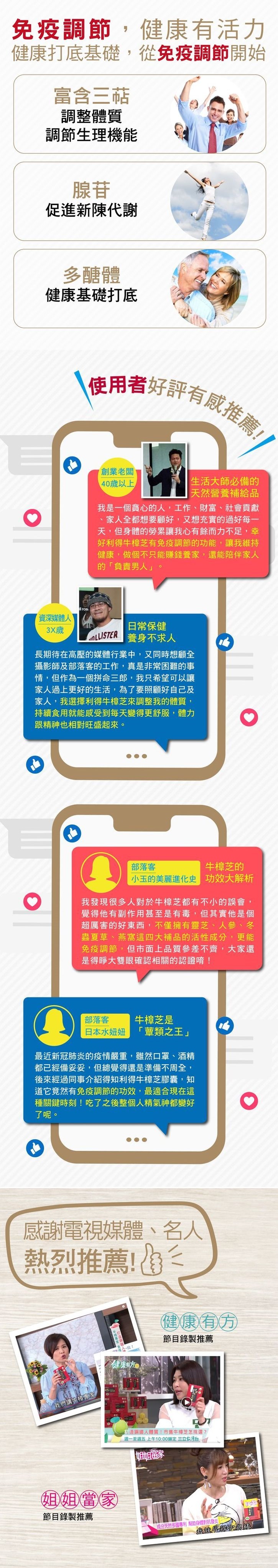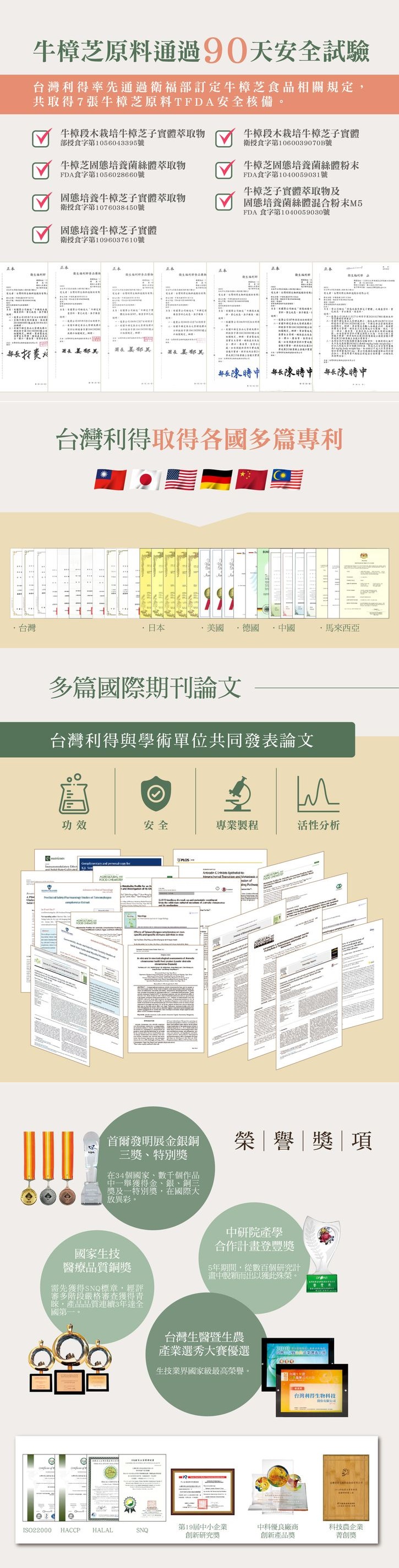成分:牛樟芝固態培養菌絲體粉末(Antrodia cinnamomea)、硬脂酸鎂,植物性膠囊(羥丙基甲基纖維素、純水、鹿角菜膠、氯化鉀)