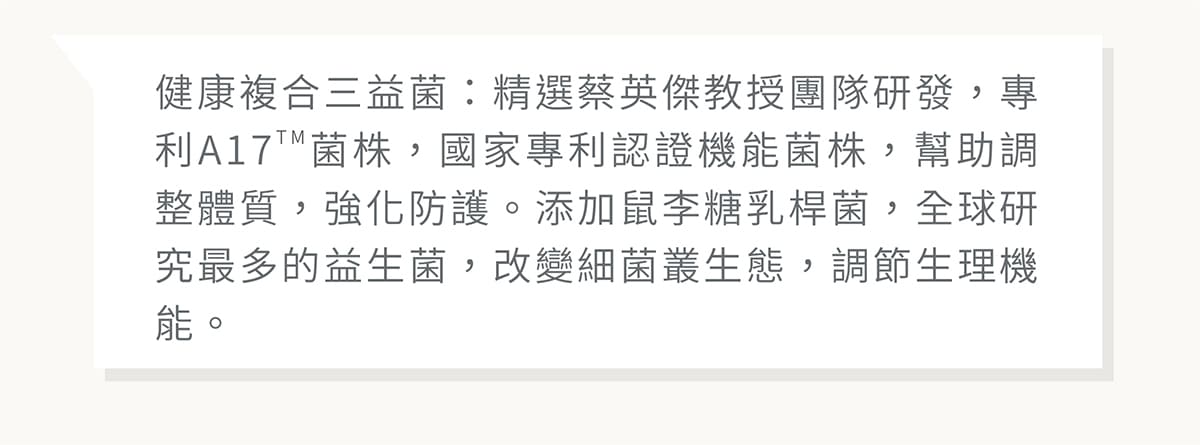 成分:異麥芽寡糖、玉米來源可溶性纖維、阿拉伯糖、複合乳酸菌( Lactococcuslactis A17、 Lactobacillus rhamnosus 、 Lactobacillus plantarum )、養樂多香料、初乳蛋白、檸檬酸、啤酒酵母發酵物