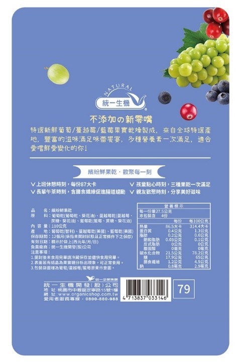 .品名:【 統一生機】 繽紛鮮果乾(110g/包)