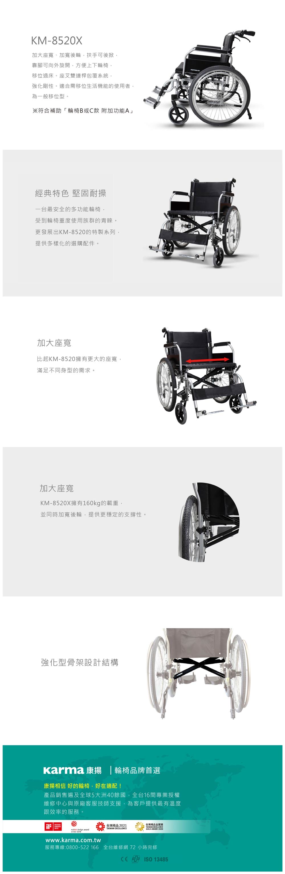 康揚karma 加大款移位機能輪椅KM8520X 座寬22吋 輪椅B或C款+A款補助 (廠送)