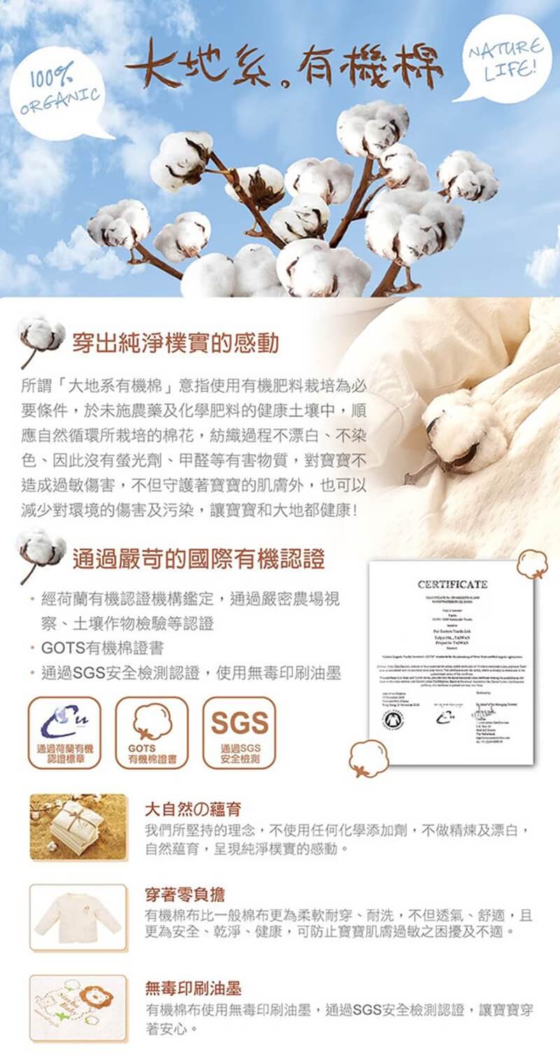 1.100%天然有機棉布、通過荷蘭CU國際有機認證。