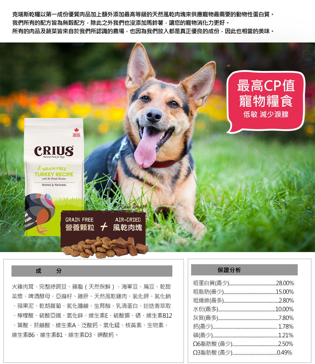 ·         CRIUS 乾糧以第一成份優質肉品加上額外添加最高等級的天然風乾肉塊來供應寵物最需要的動物性蛋白質。我們所有的配方皆為無榖配方,除此之外我們也沒添加馬鈴薯,讓您的寵物消化力更好。
