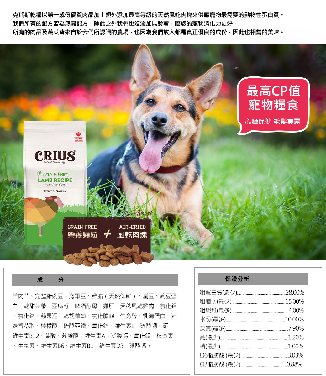 ·         CRIUS 乾糧以第一成份優質肉品加上額外添加最高等級的天然風乾肉塊來供應寵物最需要的動物性蛋白質。我們所有的配方皆為無榖配方,除此之外我們也沒添加馬鈴薯,讓您的寵物消化力更好。