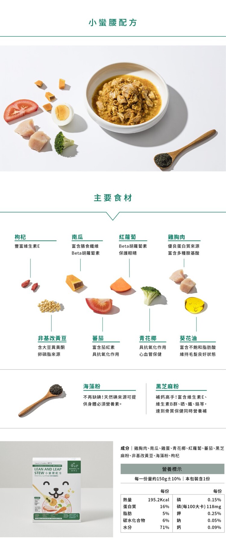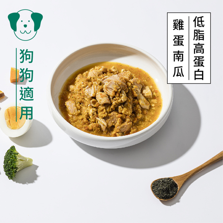 雞胸肉、南瓜、雞蛋、青花菜、紅蘿蔔、蕃茄、黃豆、枸杞、黑芝麻粉、海藻