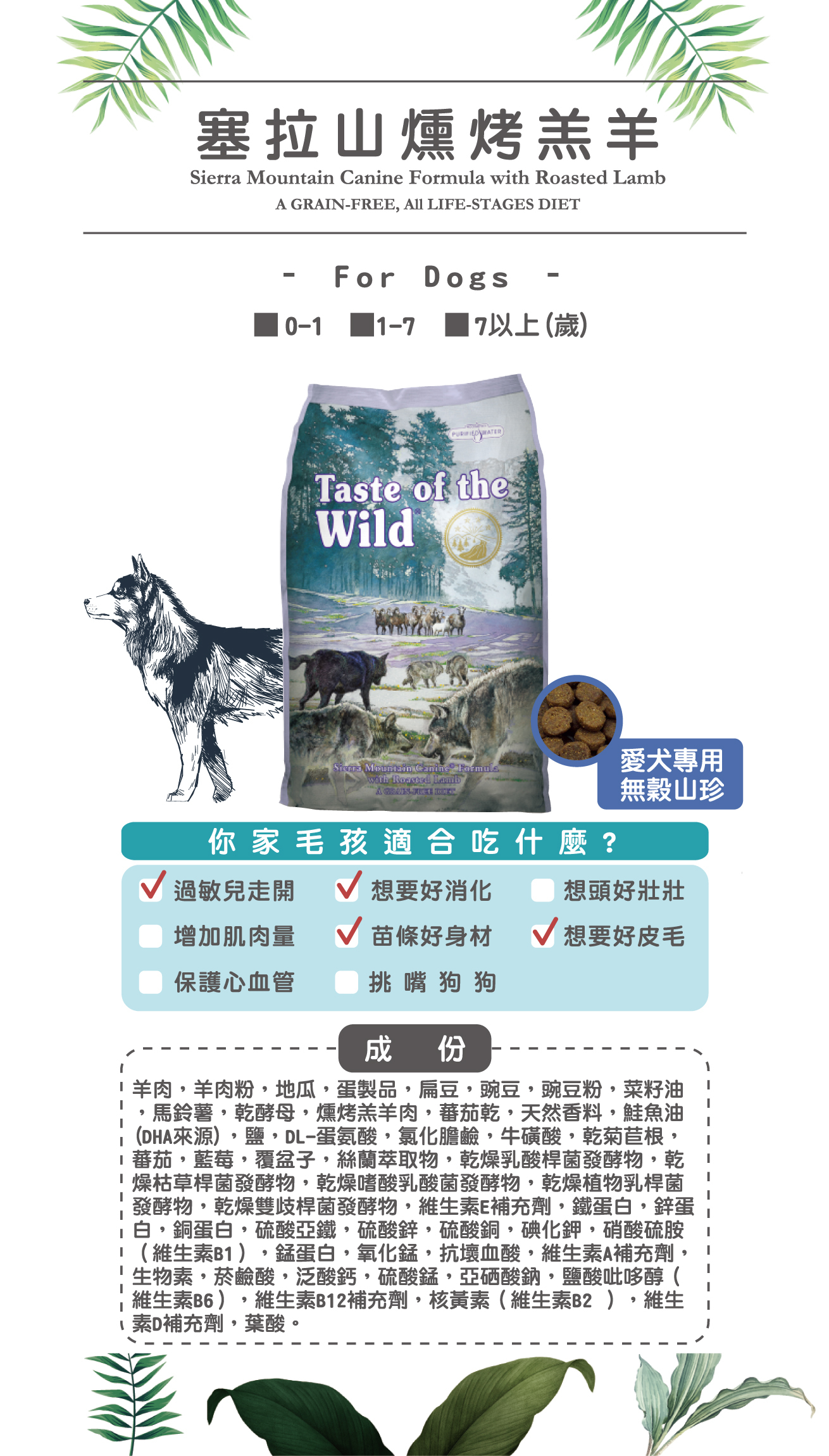羔羊,羔羊肉茸,地瓜,馬鈴薯,豌豆,菜籽油,馬鈴薯蛋白,燻烤羔羊肉,蕃茄渣,天然香料,鹽,