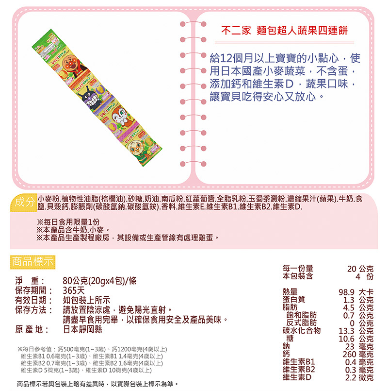 .品名:【不二家】麵包超人蔬果四連餅