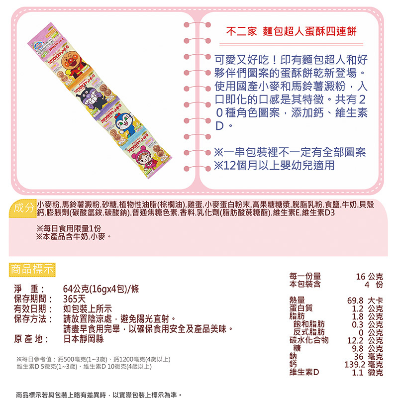 .品名:【不二家】麵包超人蛋酥四連餅