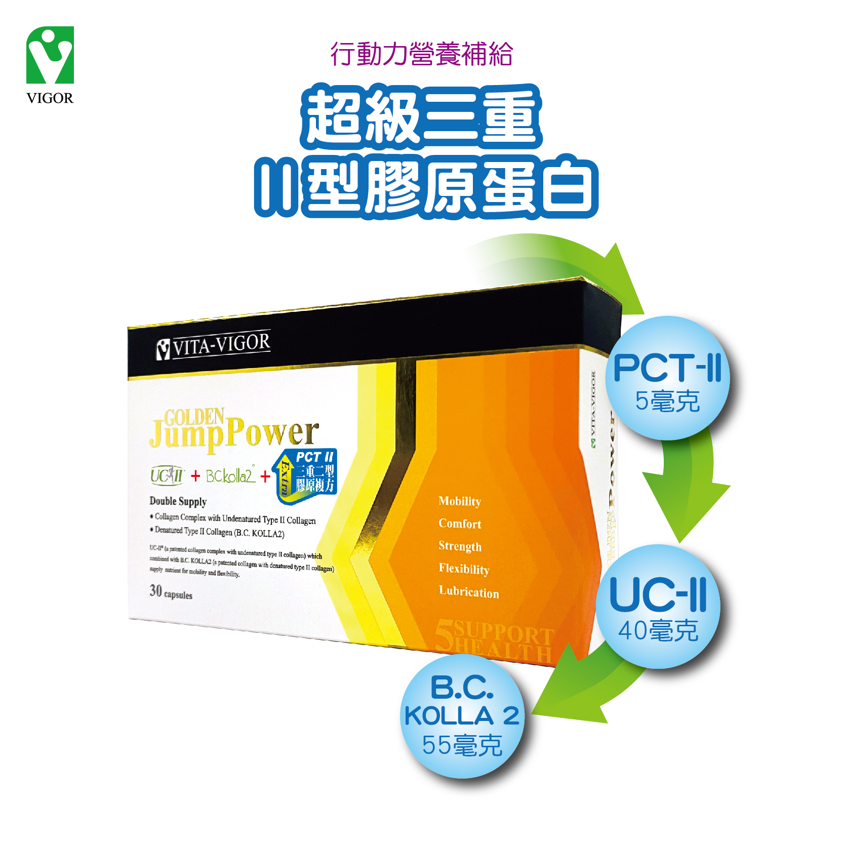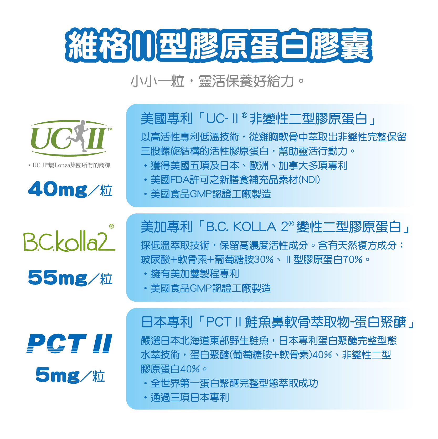 成分:Ⅱ型膠原蛋白(美國專利 B.C. KOLLA 2 變性)、Ⅱ型膠原蛋白(美國專利 UC-Ⅱ®非變性)、鮭魚鼻軟骨萃取物(日本專利PCT Ⅱ非變性)。
