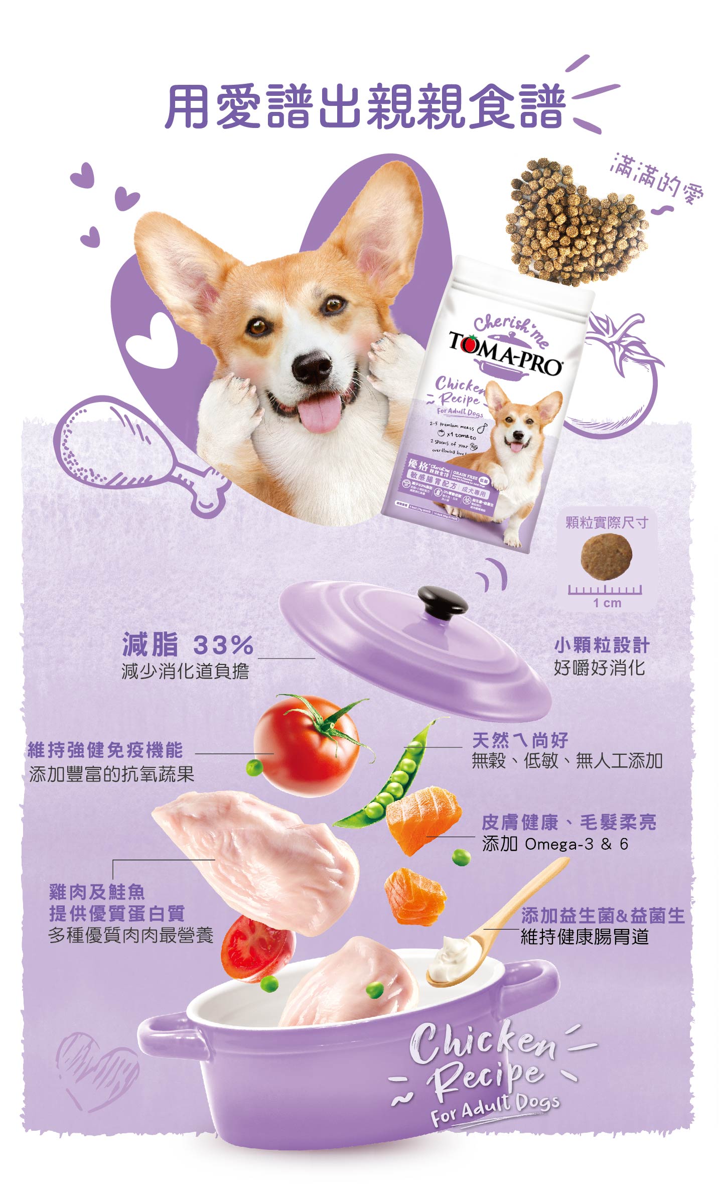 .成分:濃縮雞肉, 乾鷹嘴豆, 乾馬鈴薯, 豌豆粉, 乾燥甜菜根, 天然調味料, 雞脂(以混和生育酚保存), 乾豌豆, 豌豆纖維, 纖維素粉, 濃縮鮭魚, 濃縮火雞肉, 乾燥蕃茄粕, 鮭魚油(以混和生育酚保存), 食鹽, 研磨亞麻籽, 酵母萃取物 (啤酒酵母), 氯化膽鹼, 乾燥菊苣根 (菊苣纖維與果寡糖之來源), 乾燥雞蛋, 維生素 (維生素E, 維生素A, 維生素D3, 維生素B12, 維生素C, 核黃素(維生素B2), 硫胺素(維生素B1), 葉酸, 生物素(維生素B7), 鹽酸吡哆醇(維生素B6), 菸鹼酸(維生素B3), 維生素K, 胡蘿蔔素, 泛酸鈣(維生素B5)), 礦物質 (硫酸銅, 碘酸鈣, 硫酸亞鐵, 氧化錳, 氧化鋅, 亞硒酸鈉, 蛋白質螯合銅, 蛋白質螯合鐵, 蛋白質螯合鋅, 蛋白質螯合錳), DL-甲硫氨酸, 牛磺酸, 蕬蘭萃取物, L-抗壞血酸-2-聚磷酸鹽(維生素C活性來源), 鹽酸鹽葡萄糖胺, 左旋肉鹼, 肌醇(維生素B8), 軟骨素, 嗜酸乳酸桿菌, 乾酪乳酸桿菌, 比菲德氏菌, 腸球F菌