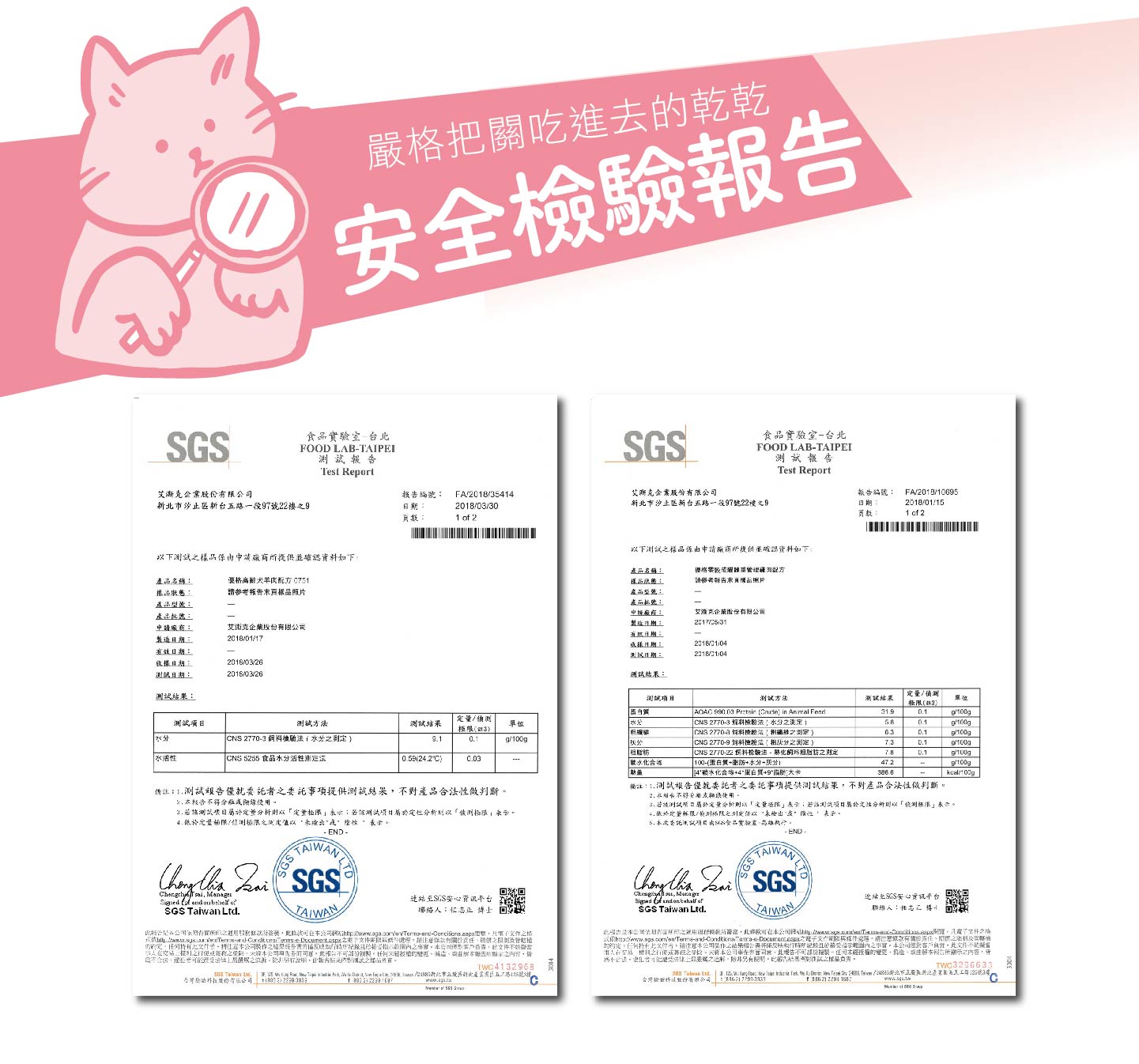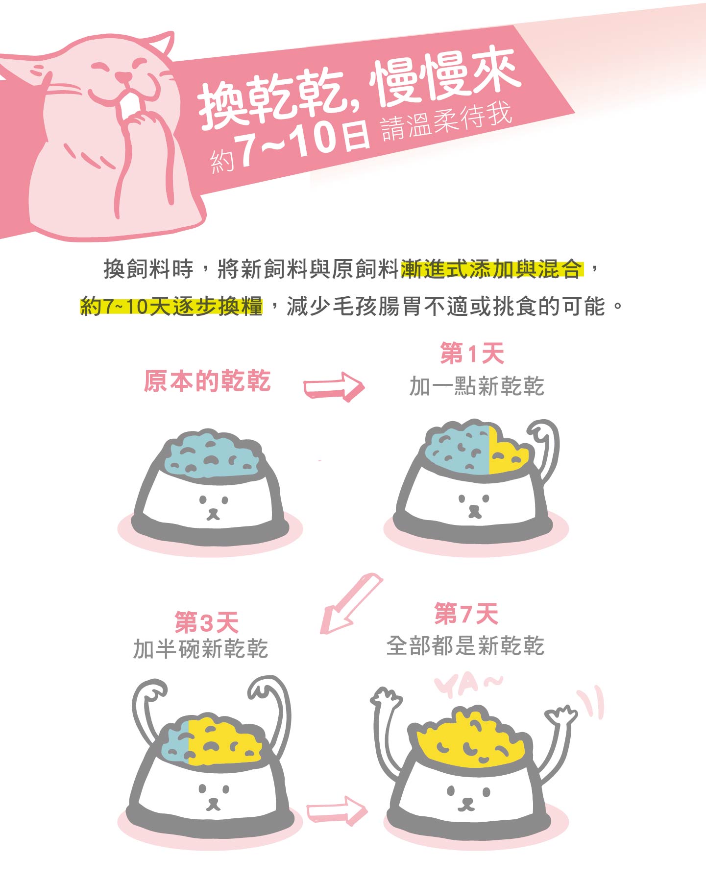 .成分:濃縮雞肉, 乾鷹嘴豆, 乾豌豆 豌豆粉, 雞脂(以混和生育酚保存), 脫水馬鈴薯, 纖維素粉, 豌豆蛋白, 天然調味料, 乾燥甜菜根, 濃縮鮭魚, 濃縮火雞肉, 乾燥蕃茄粕, 鮭魚油(以混和生育酚保存), 氯化膽鹼, 食鹽, 乾燥雞蛋, 研磨亞麻籽, 酵母萃取物 (啤酒酵母), 乾燥菊苣根 (菊苣纖維與果寡糖之來源), 維生素 (維生素A, 維生素D3, 維生素E, 菸鹼酸(維生素B3), 硫胺素(維生素B1), 維生素C, 泛酸鈣(維生素B5), 核黃素(維生素B2), 鹽酸吡哆醇(維生素B6), 葉酸, 生物素(維生素B7), 胡蘿蔔素, 維生素B12, 維生素K), 礦物質(蛋白質螯合鋅, 硫酸亞鐵, 氧化鋅, 蛋白質螯合鐵, 硫酸銅, 亞硒酸鈉, 蛋白質螯合銅, 蛋白質螯合錳, 氧化錳, 碘酸鈣), 牛磺酸, DL-甲硫氨酸, 蕬蘭萃取物, L-抗壞血酸-2-聚磷酸鹽(維生素C活性來源), 肌醇(維生素B8), 嗜酸乳酸桿菌, 乾酪乳酸桿菌, 比菲德氏菌, 腸球F菌