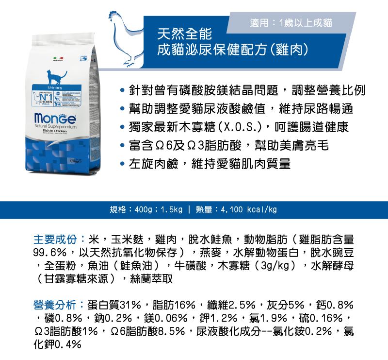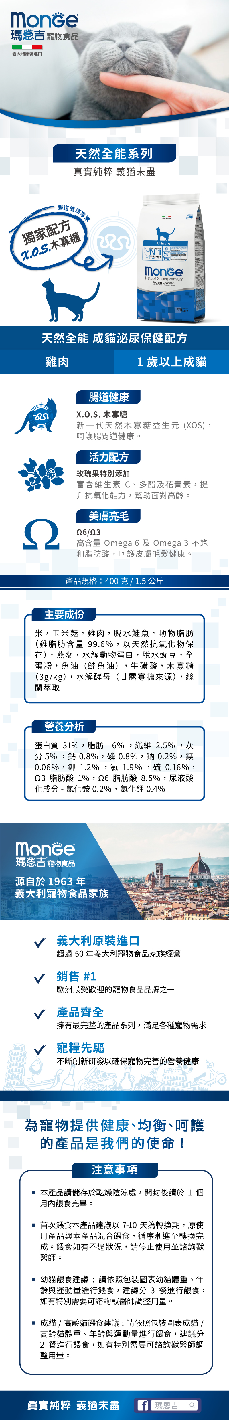 【Monge 瑪恩吉】天然全能泌尿保健成貓雞肉1.5kg