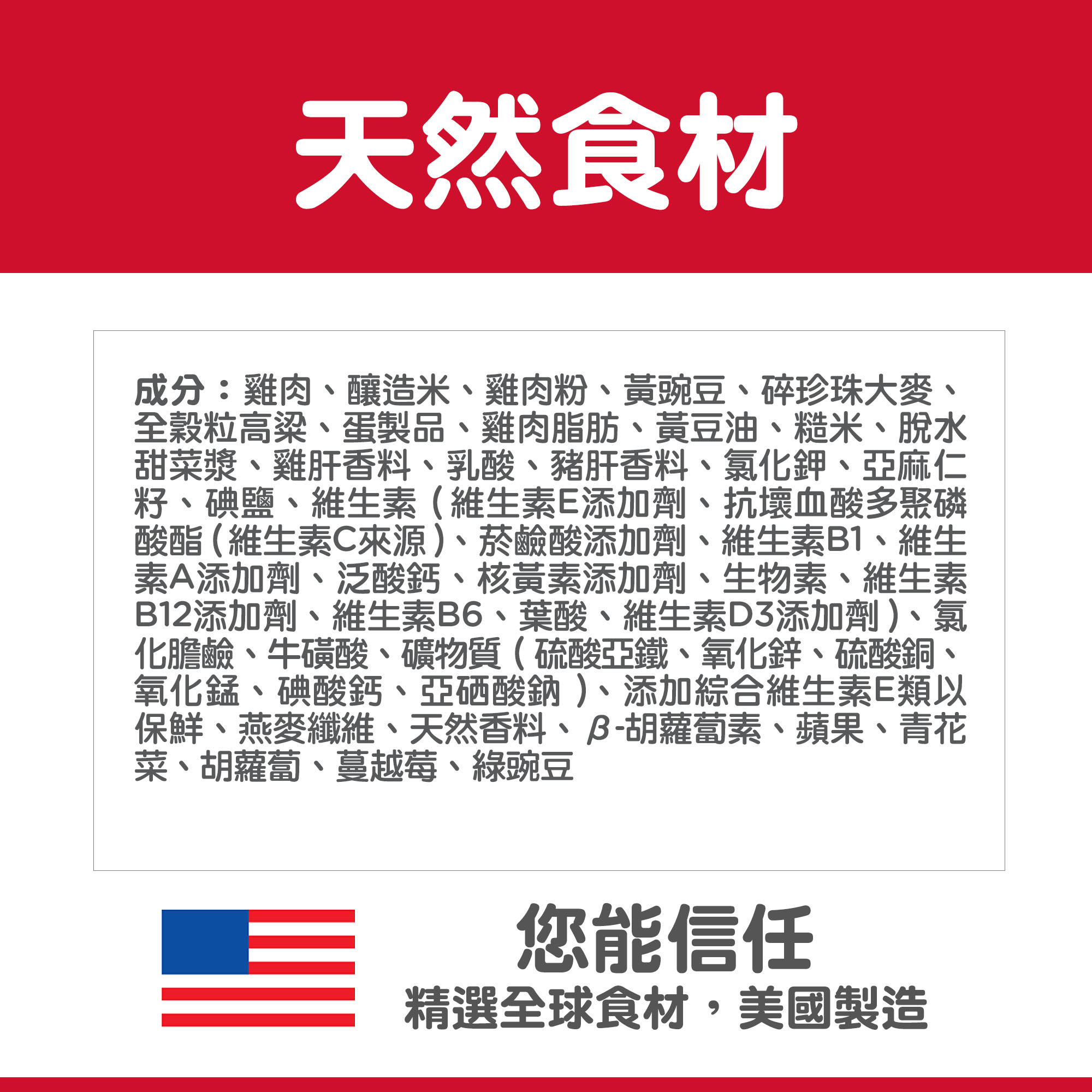 .成分:雞肉、釀造米、雞肉粉、黃豌豆、碎珍珠大麥、全穀粒高粱、蛋製品、雞肉脂肪、黃豆油、糙米、脫水甜菜漿、雞肝香料、乳酸、豬肝香料、氯化鉀、亞麻仁籽、碘鹽、維生素 (維生素E添加劑、抗壞血酸多聚磷酸酯(維生素C來源)、菸鹼酸添加劑、維生素B1、維生素A添加劑、泛酸鈣、核黃素添加劑、生物素、維生素B12添加劑、維生素B6、葉酸、維生素D3添加劑)、氯化膽鹼、牛磺酸、礦物質 (硫酸亞鐵、氧化鋅、硫酸銅、氧化錳、碘酸鈣、亞硒酸鈉)、添加綜合維生素E類以保鮮、燕麥纖維、天然香料、β-胡蘿蔔素、蘋果、青花菜、胡蘿蔔、蔓越莓、綠豌豆
