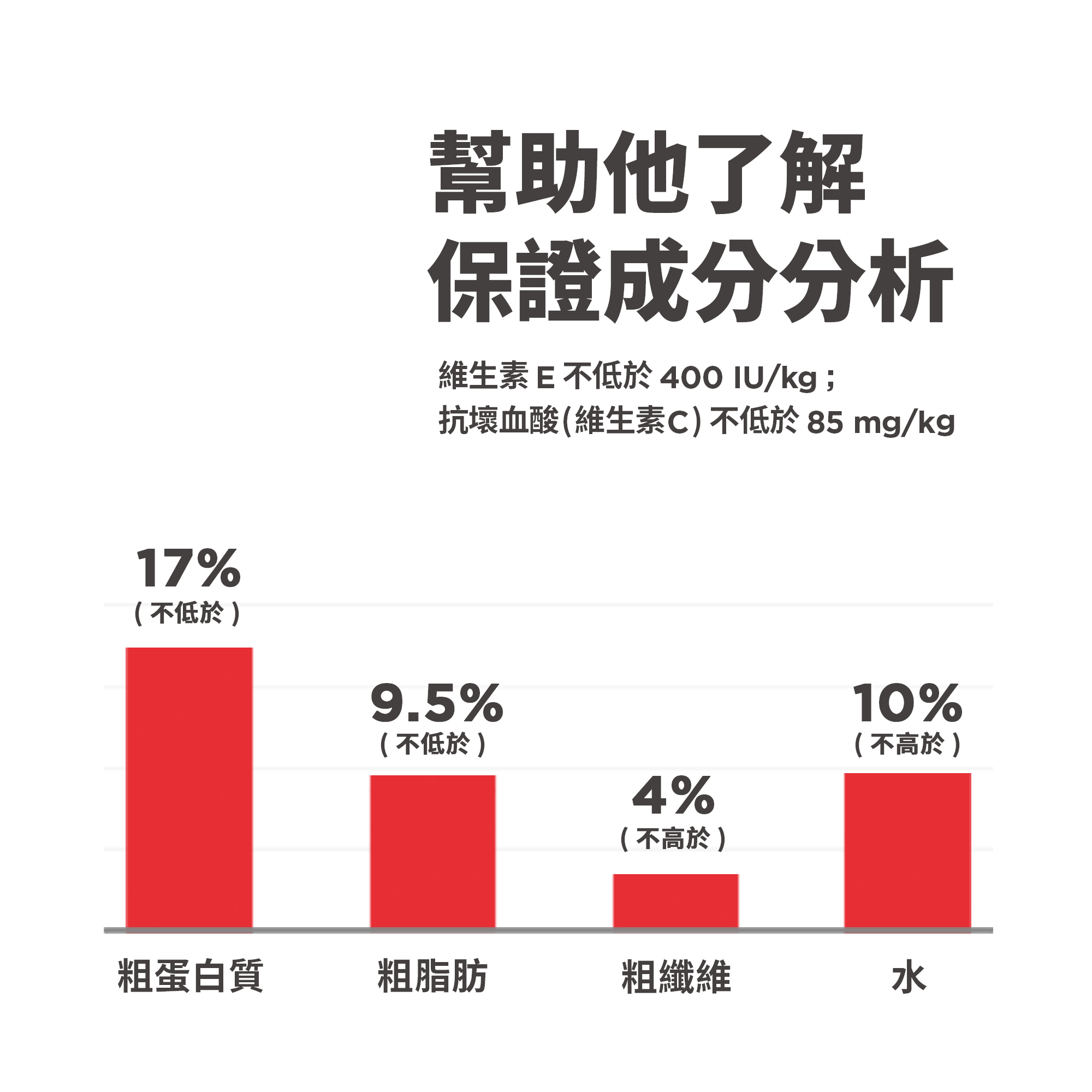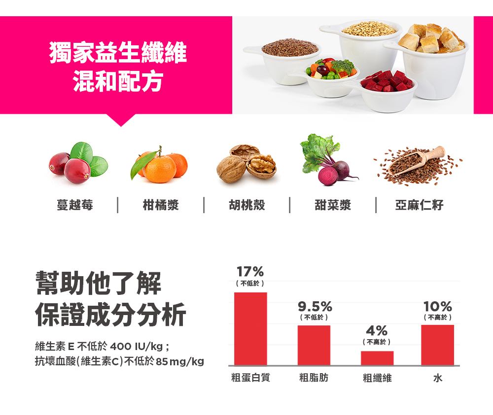 .成分:雞肉、碎珍珠大麥、全穀粒燕麥、糙米、釀造米、全穀粒玉米、玉米筋質粉、雞肉粉、雞脂肪、雞肝香料、豬肝香料、黃豆油、胡桃殼粉、乳酸、氯化鉀、亞麻仁籽、脫水甜菜漿、碳酸鈣、脫水柑橘漿、碘鹽、磷酸二鈣、氯化膽鹼、壓萃蔓越莓、維生素 (維生素E添加劑、抗壞血酸多聚磷酸酯(維生素C來源)、菸鹼酸添加劑、維生素B1、維生素A添加劑、泛酸鈣、核黃素添加劑、生物素、維生素B12添加劑、維生素B6、葉酸、維生素D3添加劑)、南瓜、魚油、DL-蛋胺酸、礦物質 (硫酸亞鐵、氧化鋅、硫酸銅、氧化錳、碘酸鈣、亞硒酸鈉)、牛磺酸、添加綜合維生素E類以保鮮、天然香料、左旋肉酸素、β-胡蘿蔔素