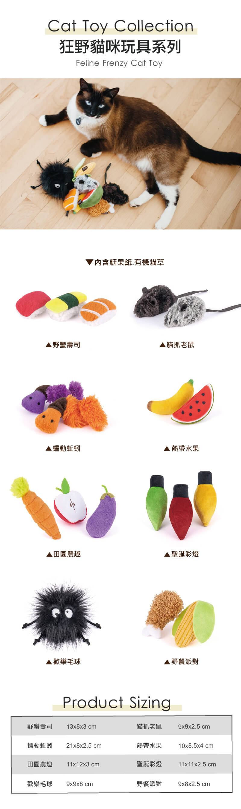 ‧材質:Exterior表皮 - Velboa短毛絨 (100% PE聚酯纖維); 美國USDA有機認證貓薄荷、Filler填充層 - polyfiber PLANETFILL® made of recycled PET bottles 由受認證的環保再生塑膠瓶製造