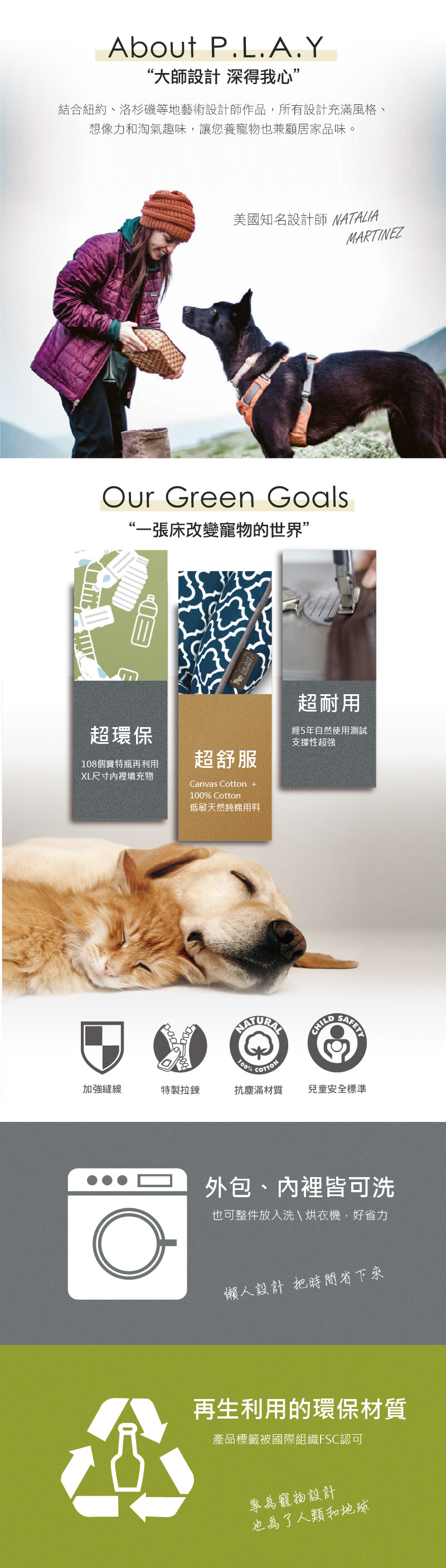 ‧材質:Exterior表皮 - Velboa短毛絨 (100% PE聚酯纖維); Filler填充層 - polyfiber PLANETFILL® made of recycled PET bottles 由受認證的環保再生塑膠瓶製造
