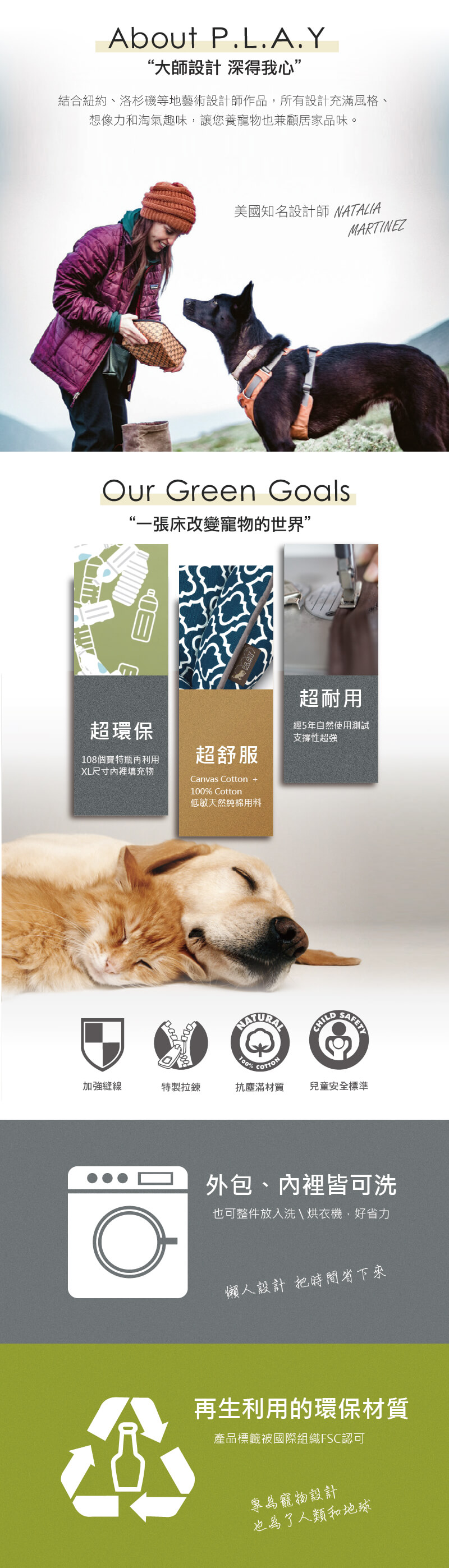 ‧材質:Exterior表皮 - Velboa短毛絨 (100% PE聚酯纖維); Filler填充層 - polyfiber PLANETFILL® made of recycled PET bottles 由受認證的環保再生塑膠瓶製造