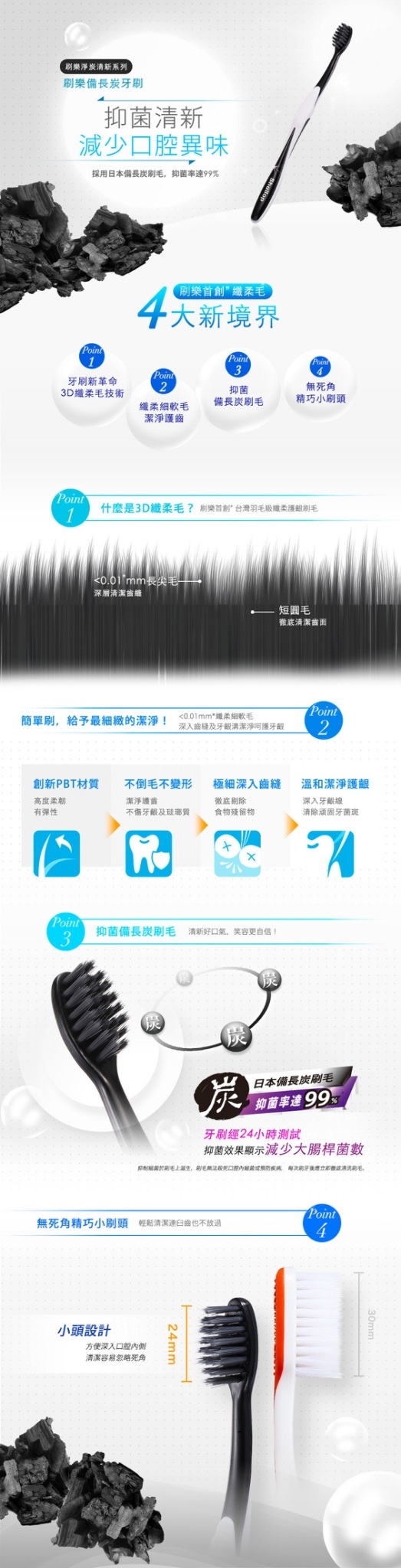 .材質:刷毛材質:PBT(熱塑性聚酯樹脂)纖柔細軟毛、備長炭