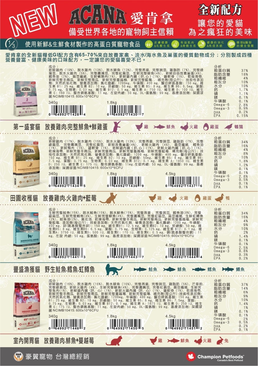 愛肯拿的全新貓糧低GI配方使用新鮮&生鮮食材製作的高蛋白質寵物食品自產自銷,