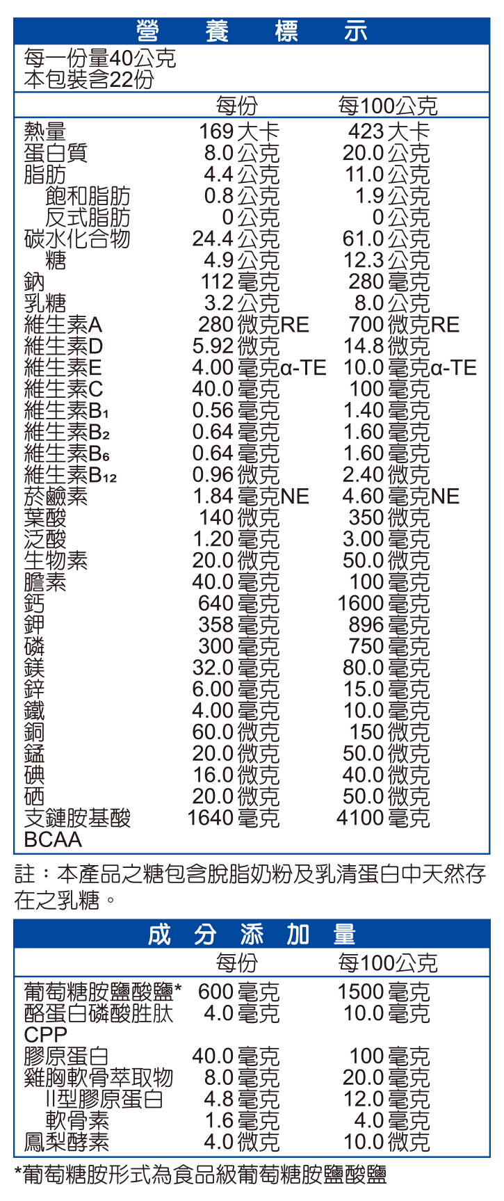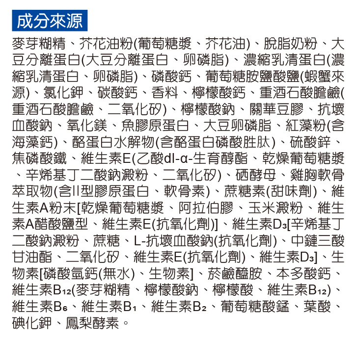 .成分:麥芽糊精、芥花油粉[葡萄糖漿、芥花油]、脫脂奶粉、大豆分離蛋白(大豆分離蛋白、卵磷脂)、濃縮乳清蛋白 (濃縮乳清蛋白、卵磷脂)、磷酸 鈣、葡萄糖胺鹽酸鹽(蝦蟹來源)、氯化鉀、碳酸鈣、香料、檸檬酸鈣、重酒石酸膽鹼(重酒石酸膽鹼、二氧化矽)、檸檬酸鈉、關華豆膠、抗壞血酸鈉、氧化鎂、魚膠原蛋白、大豆卵磷脂、紅藻粉(含海藻鈣)、酪蛋白水解物(含酪蛋白磷酸胜肽)、硫酸鋅、焦磷酸鐵、維生素E(乙酸 dl-α-生育醇酯、葡萄糖漿、辛烯基丁二酸鈉澱粉、二氧化矽)、硒酵母、雞胸軟骨萃取物(含二型膠原蛋白、軟骨素)、蔗糖素(甜味劑)、維生素A粉末[葡萄糖漿、阿拉伯膠、玉米澱粉、 維生素A醋酸鹽型、維生素E(抗氧化劑)]、維生素D3[辛烯基丁二酸鈉澱粉、蔗糖、L-抗壞血酸鈉(抗氧化劑)、中鏈三酸甘油酯、二氧化矽、維生素E(抗氧化劑)、維生素D3]、生物素[磷酸氫鈣(無水)、生物素]、菸鹼醯胺、本多酸鈣、維生素B12(麥芽糊精、檸檬酸鈉、檸檬酸、維生素B12)、維生素B6、維生素B1、維生素B2、葡萄糖酸錳、葉酸、碘化鉀、鳳梨酵素。