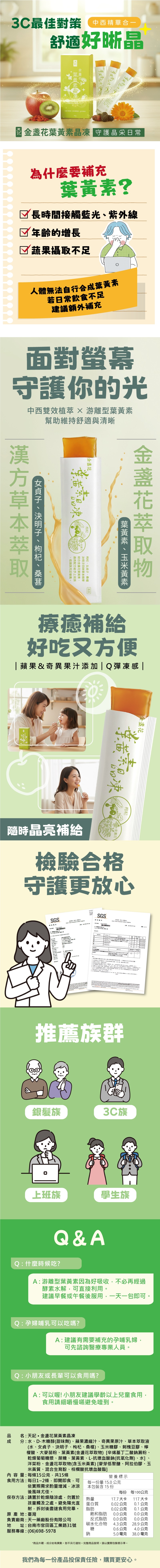 主要成分:水、D-木醣醇(甜味劑)、蘋果濃縮汁、奇異果原汁、草本萃取液(水、女貞子、決明子、枸杞、桑椹)、玉米糖膠、刺槐豆膠、葉黃素(麥芽糊精、金盞花萃取物濃縮物、羥丙基甲基纖維素、聚山梨醇酯80、混合生育酚)、檸檬酸、大麥苗粉、洋菜粉、金盞花萃取物(含玉米黃素、麥芽低聚醣、阿拉伯膠、玉米黃質、混合生育酚、棕梠酸抗壞血酸酯)。