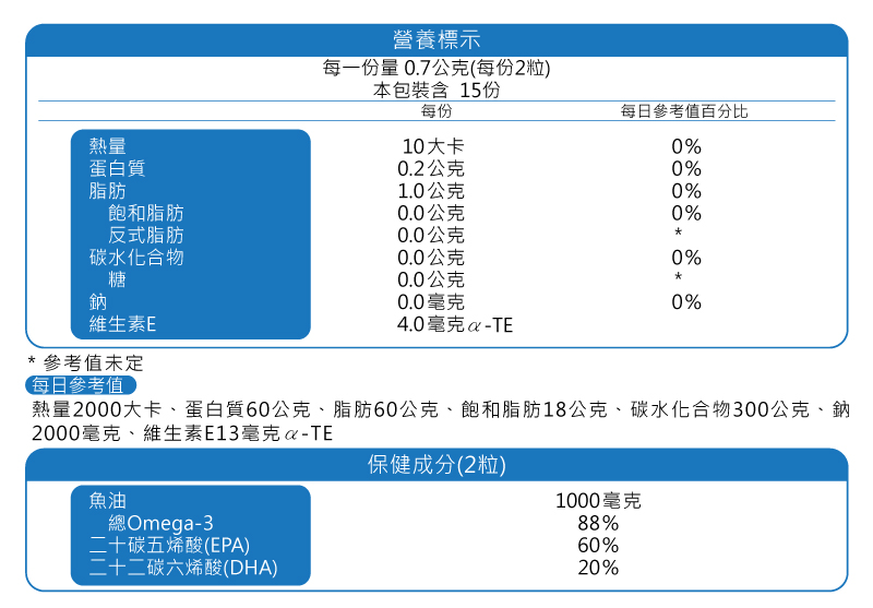 • 成分:西班牙專利高濃度魚油(含總Omega-3 88%、EPA 60%、DHA 20%)、維生素E(抗氧化劑);軟膠囊:明膠、甘油、純水。