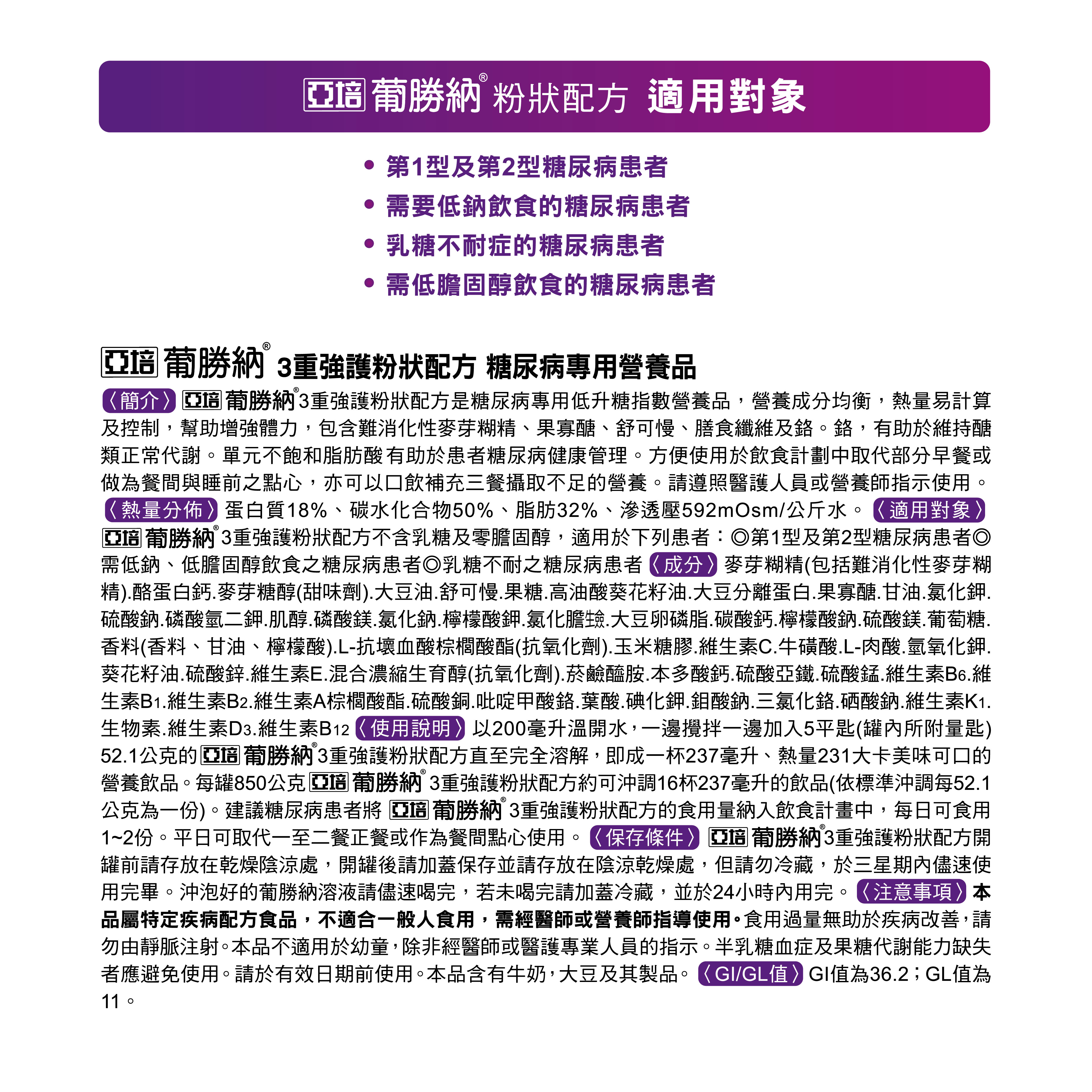 • 糖尿病適用之粉狀營養品
