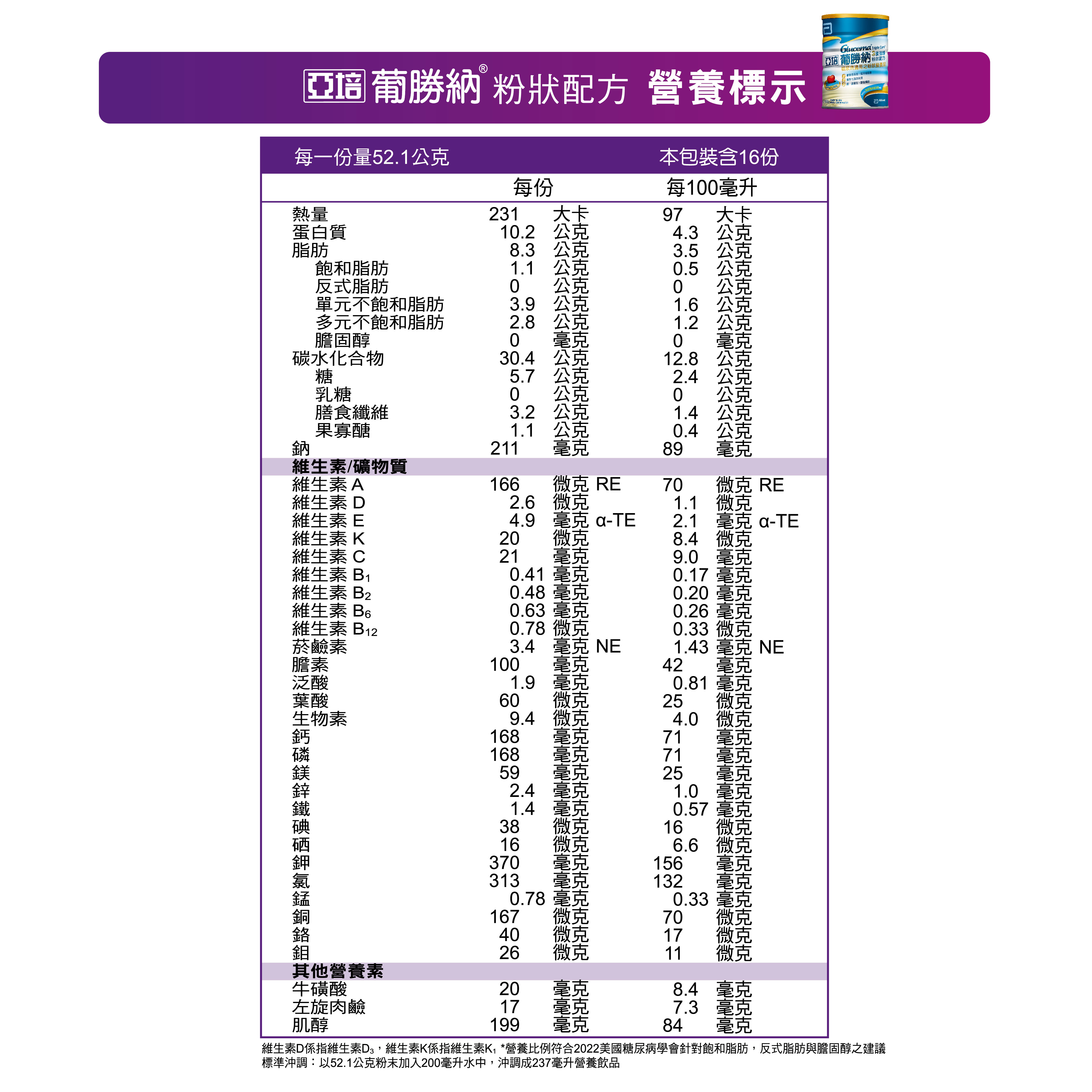 .成分:麥芽糊精(包含難消化性麥芽糊精)、酪蛋白鈉及鈣、高油酸葵花籽油、大豆油、果糖、麥芽糖醇(甜味劑)、礦物質、大豆聚醣、果寡醣、香料、維生素、肌醇、L-肉酸、牛磺酸