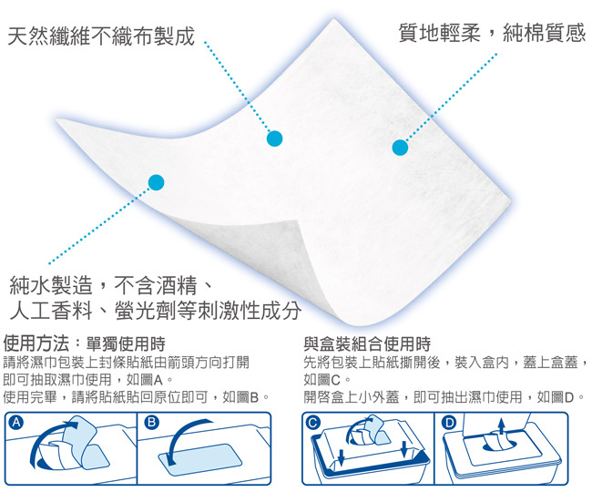• 1. 使用後務必貼回封蓋貼紙,以常保濕巾的濕潤及潔淨。