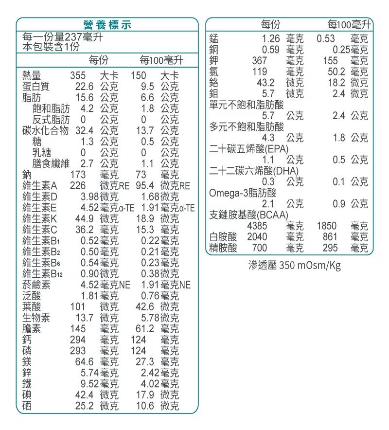 .成分:水、麥芽糊精、酪蛋白鈣(含精胺酸)、芥花油、酪蛋白鈉(含精胺酸)、中鏈三酸甘油酯(MCT)、菊糖、魚油(含EPA和DHA)、葡萄糖漿、磷酸氫二鉀、脂肪酸甘油酯、重酒石酸膽鹼、乳酸硬脂酸鈉、檸檬酸鉀、檸檬酸鈉、香料、脂肪酸蔗糖酯、碳酸鎂、氯化鈉、抗壞血酸鈉、抗壞血酸、橄欖油、葡萄籽油、羅漢果醣苷萃取物(甜味劑)、單水硫酸亞鐵、硫酸鋅、乙酸維生素E、菸鹼醯胺、本多酸鈣、二氧化矽、硫酸亞鐵、硫酸錳、辛烯基丁二酸鈉澱粉、阿拉伯膠、維生素E(抗氧化劑)、硫酸銅、玉米澱粉、維生素B1、維生素B6、蔗糖、維生素B2、乙酸維生素A、葉酸、三氯化鉻、維生素K1、碘化鉀、硒酸鈉、生物素、檸檬酸、維生素D3、維生素B12。