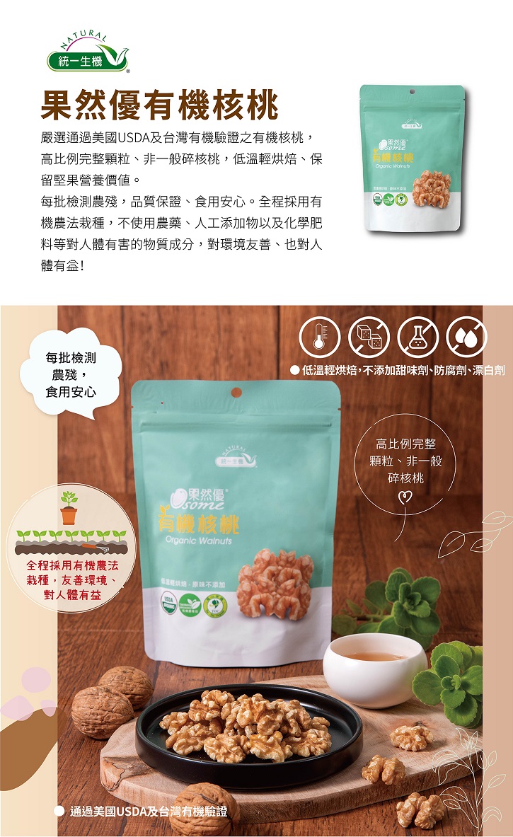 精選有機驗證之有機核桃,低溫輕烘焙、原味不添加