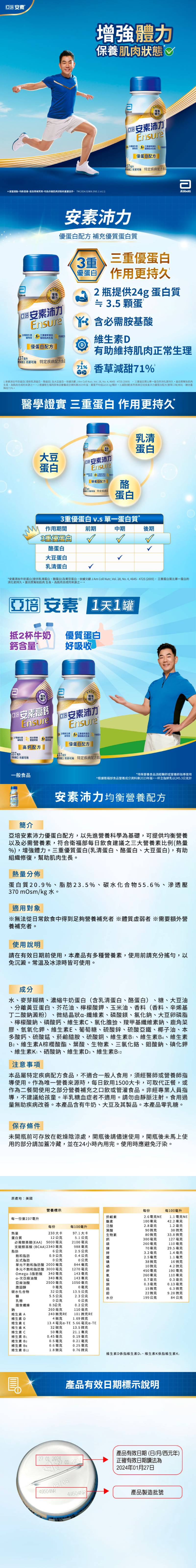 .成分:水、麥芽糊精、濃縮牛奶蛋白、糖、大豆油、分離黃豆蛋白、礦物質(檸檬酸鉀、磷酸鎂、氯化鈉、檸檬酸鈉、碳酸鈣、磷酸鈣、硫酸鋅、硫酸亞鐵、硫酸錳、硫酸銅、三氯化鉻、鉬酸鈉、碘化鉀、硒酸鈉)、菜籽油、玉米油、香料(香料、辛烯基丁二酸鈉澱粉)、微結晶狀α-纖維素.、維生素(維生素C、氯化膽生鹼、維生素E、本多酸鈣、菸鹼醯胺、維生素B1、維生素B6、維生素B2、維生素A棕櫚酸酯、葉酸、生物素、維生素K1、維生素D3、維生素B12)、大豆卵磷脂、梭甲基纖維素鈉、鹿角菜膠、氫氧化鉀、葡萄糖、椰子油。
