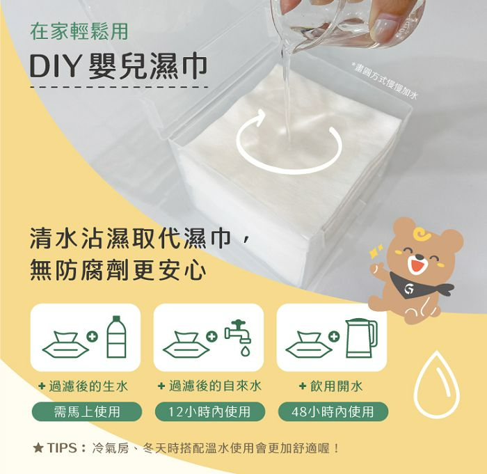 .使用方式: 1.可直接使用,也可沾開水當濕紙巾使用,擦拭效果更佳。 2.冷氣房、冬天時,取溫水沾濕使用,讓肌膚更加溫暖舒適。