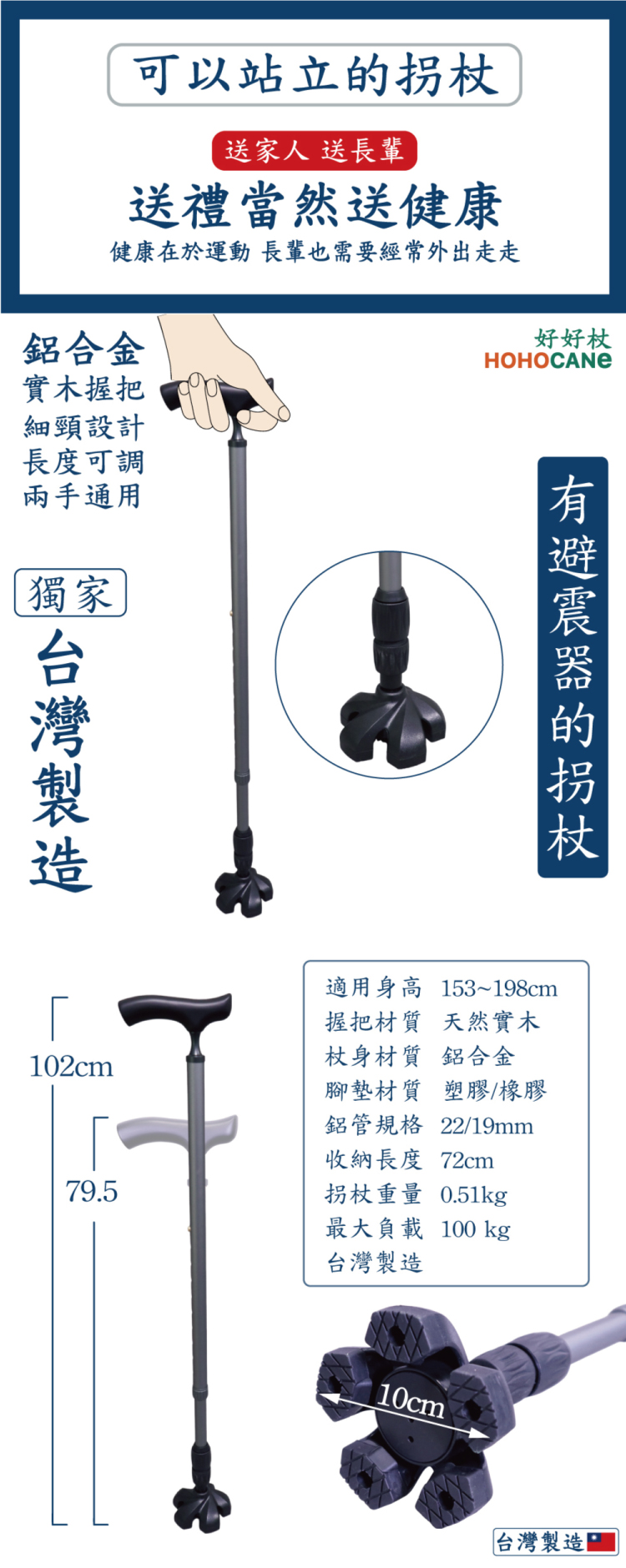 【好好杖】實木握把十段高度萬向避震器腳墊鋁合金站立拐杖-高級灰
