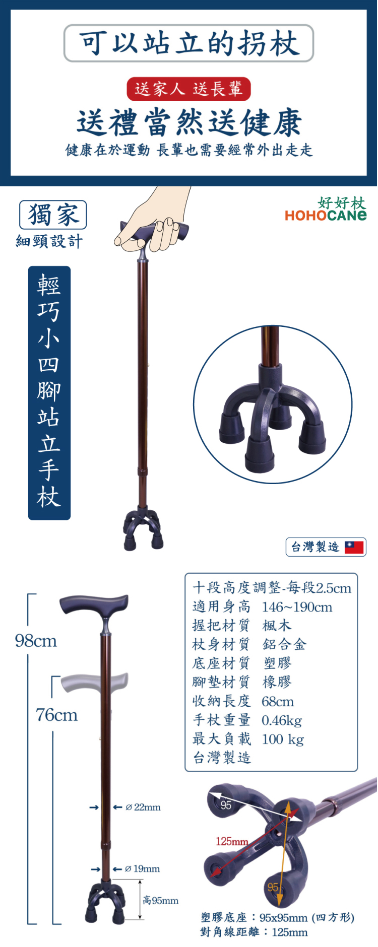 【好好杖】實木握把十段高度奥斯汀小四腳鋁合金站立拐杖-咖啡棕