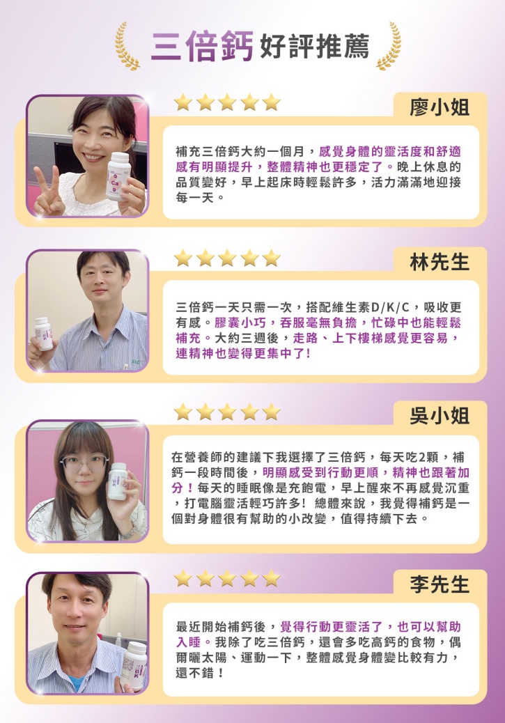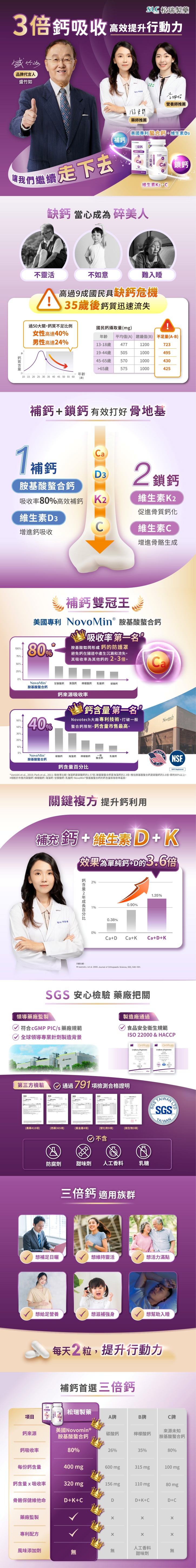 .嚴選美國NovoMin®胺基酸螯合鈣,吸收率為碳酸鈣、葡萄糖酸鈣的3倍;檸檬酸鈣、海藻鈣的2倍以上!