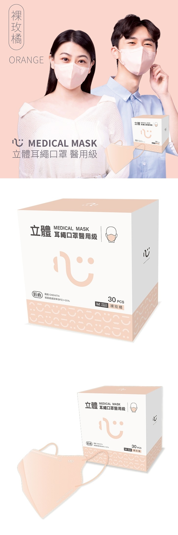 【匠心】立體耳繩醫用口罩-裸玫橘(M)-30入/盒