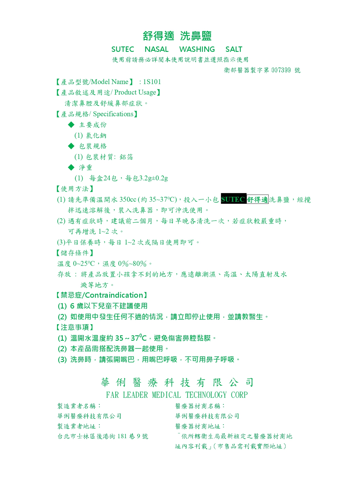 1. 成分為天然鹽,用於調製鼻腔沖洗所需的生理/等張食鹽水