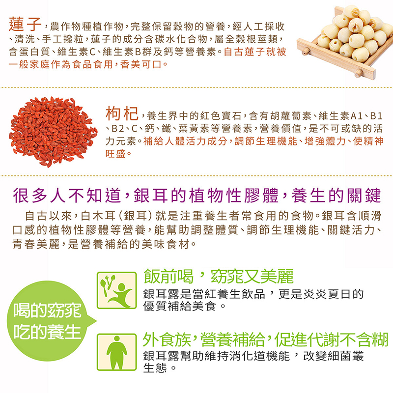 • 成分:水、冰糖、紅棗、銀耳、蓮子、枸杞。
