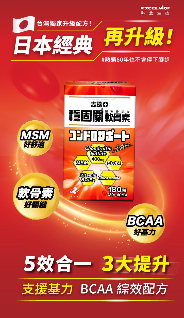 主要成分:豬軟骨萃取物(含硫酸軟骨素400毫克、二型膠原蛋白) 、BCAA(白胺酸、纈胺酸、異白胺酸)、MSM、葡萄糖胺、維生素B1、維生素B6