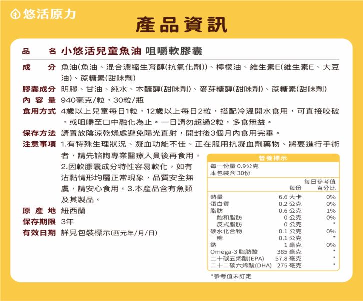 成分:魚油(魚油、混合濃縮生育醇(抗氧化劑))、檸檬油、維生素E(維生素E、大豆油)、蔗糖素(甜味劑)