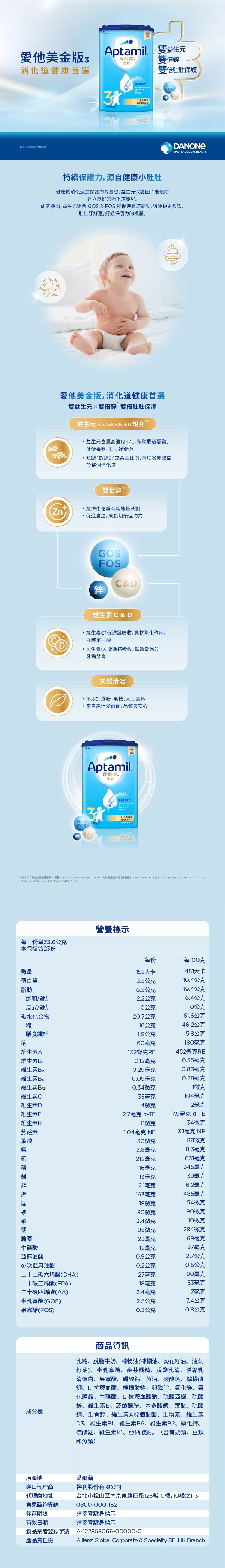 .成分:乳糖、脫脂牛奶、植物油(棕櫚油、葵花籽油、油菜籽油)、半乳寡醣、麥芽糊精、脫鹽乳清、濃縮乳清蛋白、果寡醣、磷酸鈣、魚油、碳酸鈣、檸檬酸鉀、L-抗壞血酸、檸檬酸鈉、卵磷脂、氯化鎂、 氯化膽鹼、牛磺酸、L-抗壞血酸鈉、硫酸亞鐵、硫酸鋅、維生素E、菸鹼醯胺、本多酸鈣、葉酸、硫酸銅、生育醇、維生素A棕櫚酸酯、生物素、維生素D3、維生素B1、維生素B6、維生素B2、碘化鉀、 硫酸錳、維生素K1、亞硒酸鈉。(含有奶類、豆類和魚類)