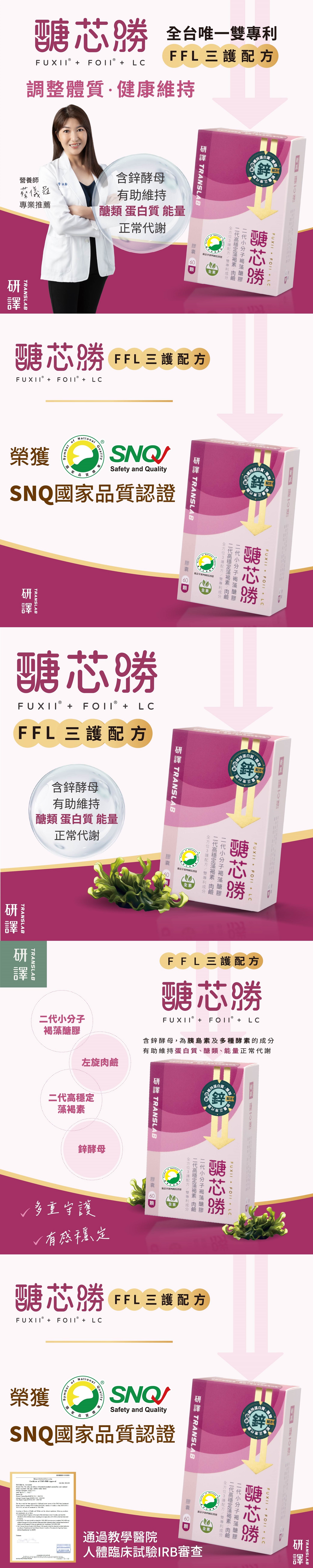 成分:昆布萃取物(含高穩定藻褐素 FUXII)(昆布取物、糊精)、昆布萃取物(含小分子褐藻醣膠 FOII)(昆布萃取物、麥芽糊精)、L-肉鹼(L-肉鹼、乙基纖維素、中鏈三酸甘油酯)、鋅酵母、硬脂酸鎂、二氧化矽