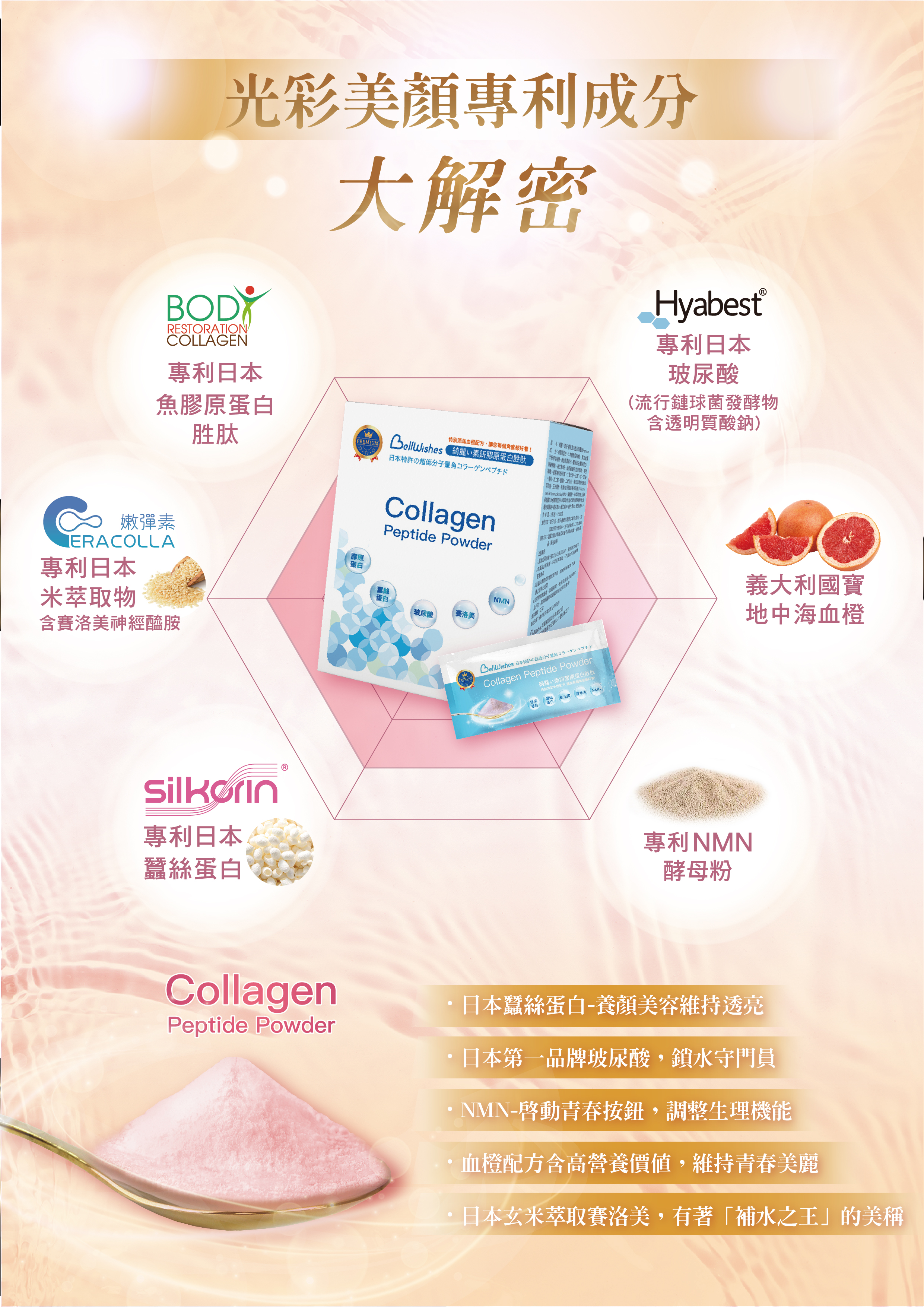 食品添加物:膠原蛋白胜肽、蠶絲蛋白、地中海血橙、酵母萃取粉(含NMN)、米萃取粉(神經醯胺)、流行鏈球菌發酵物(透明質酸鈉)
